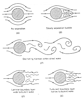 of diameter, D, at different Reynolds numbers, Re, where Re = rVD/m. (A) Re = 0.2, (B) Re = 12, (C) Re = 120, (D) Re = 30,000, (E)