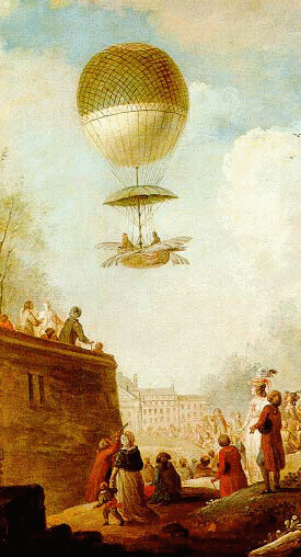shows the hydrogen filled balloon built in 1783 by Jean-Pierre Blanchard that