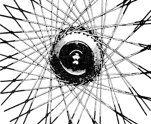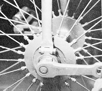 With the large (120 to 150 cm) front wheel, spoke patterns became important issue in wheel rigidity. The left photograph shows the radial spokes of a standard Columbia, the right hand diagram the tangential spoking of the 'New Rapid' wheel. The latter configuration reduced spoke bending under acceleration and braking with the concomitant advantage of increased spoke life. Note the wired crossing points of the tangential spokes which reduces their effective free length. |