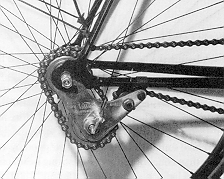 In the 1930's the Derailleur gear was introduced to permit gear changes during riding so as to enhance hill climbing capability. A 1934 model is illustrated. Chain transfer between cogs on the rear hub gave rise to the ratio change. |