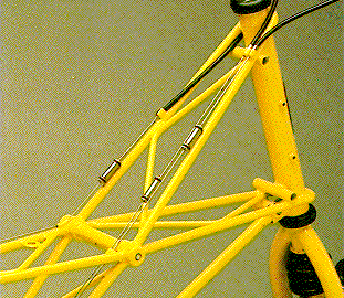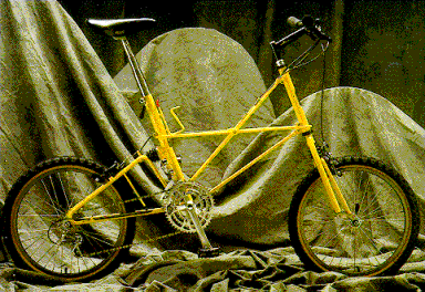The Mountain Bike was born in California in the 1970's. Early bikes used old Schwinn Excelsior frames and removed unnecessary components. Their heavy (23 kg) construction made them durable, but not easy to get to the top of a mountain! By 1977, special bikes with weights as low as 16 kg were being made. An interesting 'modern' example is the Moulton Mountain ATB shown below. It has both front and rear suspension, small diameter high-pressure tires, and a triangulated multi-tube frame. |