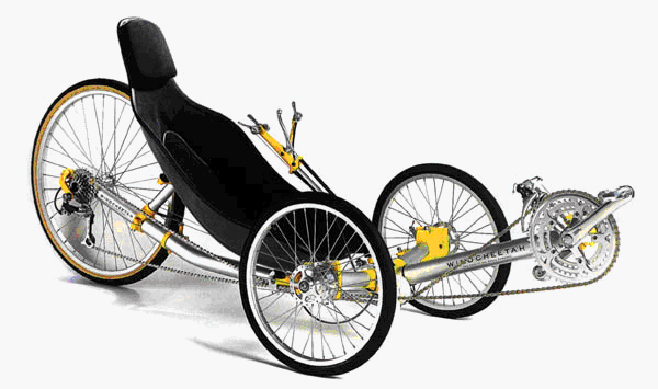 The Windcheetah tricycle reduces the aerodynamic drag by decreasing the frontal area of the bike/rider system. The penalty for this design is the weight of the extra wheel and the increased rolling resistance of three wheels as compared to two. Rolling resistance is also wheel diameter dependent, and the small front wheels each have a larger rolling resistance than the larger rear wheel. |