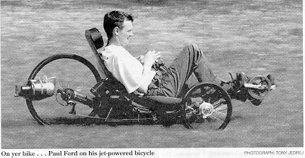 While a jet engine may not be the best solution for powering a bike, this three wheeled bike has a small jet engine that can take its speed over 100 kph. At this speed the rider observed that the steering was very touchy! |