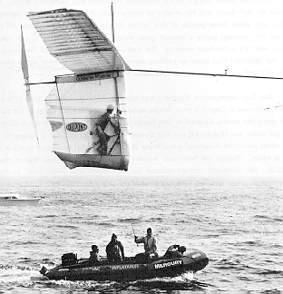This photograph shows a critical moment in the flight of the Gossamer Albatross across the English Channel. The flight had started in calm weather and the plane was flown close to the sea to take advantage of the ground effect. Well into the flight a head-wind increased and the sea became rough causing the near surface air to become turbulent. The pilot felt exhausted and wanted to be picked up by the raft shown. To achieve this it was necessary for him to increase the altitude of the plane so that the man standing in the bow of the raft could catch a ring on the underside of the plane with a modified fishing rod and bring it down on the raft. After increasing altitude, the pilot-powerplant found that the turbulence was less and the drag on the plane reduced. He abandoned his request for a "landing" and continued the flight to France. The cyclist-pilot, Bryan Allen made the cross Channel flight of 56.3 km from Folkestone to Cap Gris-Nez in 2 hours and 49 min.
