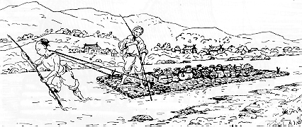 The Chinese bamboo raft shown in the top sketch illustrates two propulsion