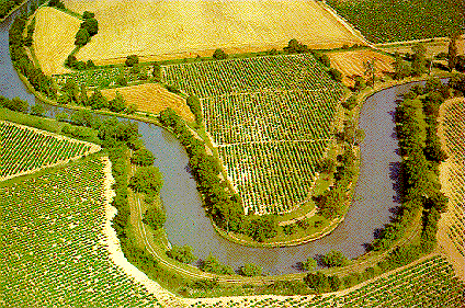 To minimize construction costs it is frequently an advantage to have a canal follow the local ground contour. This picture of the Canal du Midi close to Villesque shows the result of applying this technique. The alternative is to counter local contour changes by using dirt fill or masonry structures. |