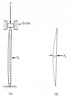 A failure mode that must be taken into account when components are used in compression is buckling. The diagram shows a strut that is long compared to its diameter. The two ends of the strut can rotate but are constrained to stay on the same vertical line. A load, F, applied to the strut causes an initial elastic response, the strut decreasing in length as the load is increased in accordance with Hooke's law. As the load F is increased one of two outcomes may result. If the rod remains stable against buckling (remains straight) the yield stress,