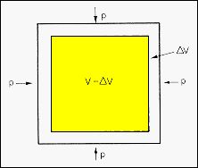 through a Hookian relationship involving the "Bulk modulus," K: p = Kd.