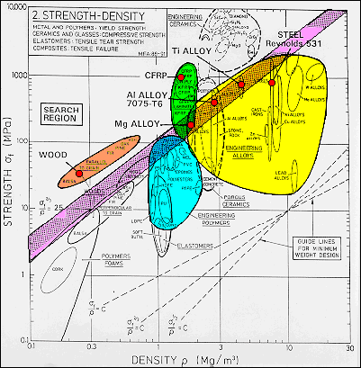 The diagram is for strength versus density and the pink band crossing the diagram is for the design criterion (sy2/3/r) = 25, a plausible value for a front fork application. Red dots on the various material fields locate possible material candidates and final selection should then examine other properties.