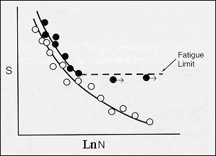 limit and exhibits a steadily decreasing fatigue life as S increases. |