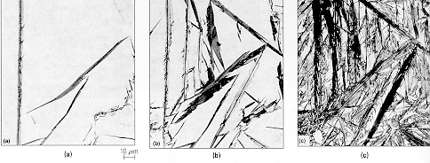 The quantity of martensite formed in a carbon steel depends upon its carbon content and the lowest temperature to which the material is taken. The micrographs below show the effect of lowest temperature on the formation of martensite in an Fe -1.8 wt % C alloy. The material is initially heated above 727 C and converted to a homogeneous austenite. The sample is then cooled through the martensite start temperature and the process is stopped at three different low temperatures. For (a) the lowest temperature is 24 C and very little martensite (dark region) is formed. In (b) the sample was taken to - 60 C and more martensite has been formed. For (c) the minimum temperature was - 100 C and the transformation has progressed even further. Because the transformation process is non-diffusive, the transformation rate is not reduced by reducing the temperature. The micrographs were taken at room temperature at which the martensite is meta-stable. The morphology of the material can be changed by heating to higher temperatures where diffusion of carbon in the alloy will convert the material to the stable form at the diffusion temperature. Reheating will also reduce the lattice strain and make the material more ductile. |