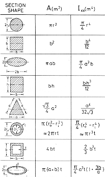 A, of these sections are listed in terms of the given dimensions. The last column lists the corresponding second moment of area, Ixx, about the horizontal x-axis shown on each diagram. These quantities are used to compute the shape factors for bending, fB, discussed on the following page.