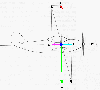 lift, L, the propeller thrust, T, and the drag, D. In steady state, that