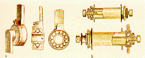 production. The (a) diagram shows balls running in V-grooves for pedal bearings.