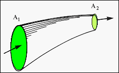The diagram shows a streamtube in a fluid flow that will be assumed to be incompressible, i.e. of constant density. The streamtube is bounded by streamlines and, therefore, fluid particles cannot cross the tube walls. In
