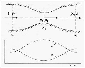 The diagram shows a flow through a duct of variable area. The center line of the duct is horizontal and the change in potential energy is zero over the region. Bernoulli's equation gives:            (rV2/2) + p = p0, or: (p0 - p) = (rV2/2), and relates the pressure, p, at each location to the corresponding fluid velocity, u. The pressure, p, is the pressure in the flow and is known as the "static pressure." The pressure, p0, is the constant total energy per unit volume in the flow and is known as the "stagnation pressure." The term (rV2/2) is identified as the "dynamic pressure" so that for the flow: