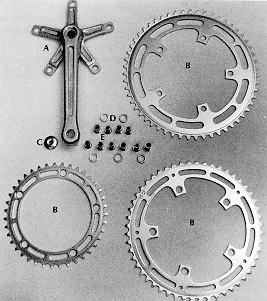The forged metal crank (A) has a 'spider' that carries the set of chainwheels