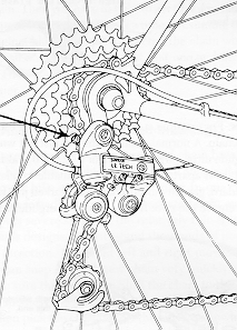 The diagrams below show the effect of correct chain length for a deraileur gear. The rear wheel's position is adjusted until the pulley cage on the deraileur swings between the two positions show. The left hand diagram shows the cage position when the chain is on the smallest freewheel cog and the smallest chainwheel. The other diagram shows the same chain riding on the largest cog and the largest chainwheel. Links may be added or removed from the chain until these two conditions are reached. |
