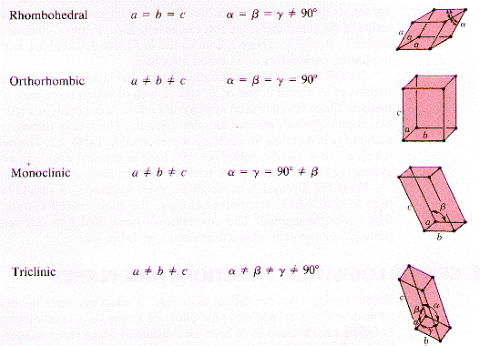 · Side and angle relationships for the Rhombohedral, Orthorhombic, Monoclinic, and Triclinic systems are shown opposite. · Triclinic is the Bravais lattice of lowest symmetry.