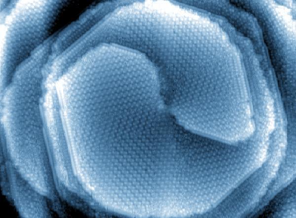| A Scanning Tunneling Microscope picture of a screw dislocation in GaN. The Burgers vector is normal to the photograph and the face is bounded with nitrogen atoms. The area is ~ 75 x75nm. From: A.R. Smith, et al, J. Vac. Sci. Technol. A 16, 1641 (1998). | ||||||
