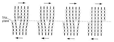 · Dislocation motion in crystals can occur when a shear stress act across the slip plane. This is illustrated for an edge dislocation. |