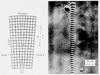 · The photomicrograph shows a tilt boundary in germanium where the dislocation locations have been revealed by chemical etching. |