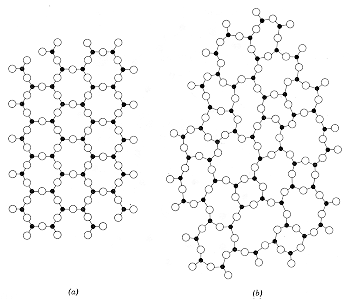 (a). Fast cooling may yield an amorphous material (b), a glass.