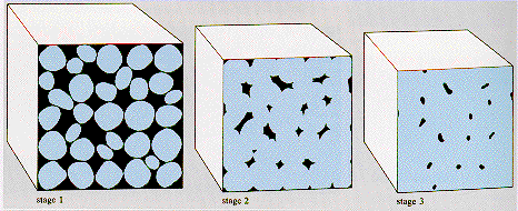 The piece still contains connected pores and channels. · By stage 3, continued sintering has removed most pores