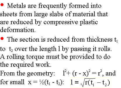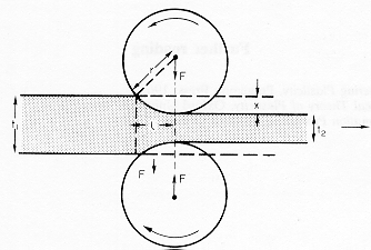 | · The rolling force, F, causes the metal to yield over the length, l, and width, w, between the rolls. Assuming an ideal plastic material with no work hardening: F =σy w l. | |||||||||||||||||