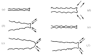· In stage-II, the crack changes direction and grows in length normal to the tensile axis. · In this stage, dislocations on planes of maximum resolved shear stress move in each stress cycle and cause the crack tip to advance. Periodic sharpening and blunting of the crack occurs under this reversed stressing condition as illustrated below.