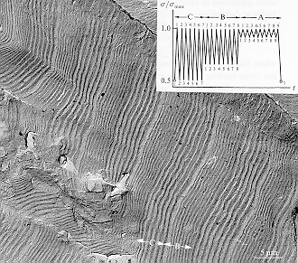 striation spacing in the B and C blocks increases as the stress amplitude increases,