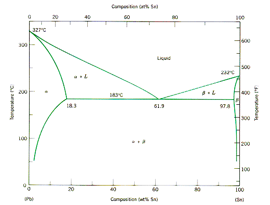 The lead-tin binary phase diagram. From: Callister,"Materials Science and Engineering," Wiley (1997)