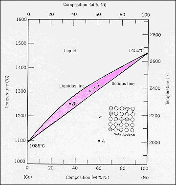 · The binary phase diagram for the copper (Cu) nickel (Ni) system shows the temperature dependence of phase stability as a function of the alloy composition. · Two zones exist in which the alloy is either solid or liquid, and there is also a two- phase zone in which the solid α and the liquid L are in mutual equilibrium. |