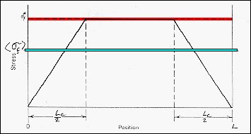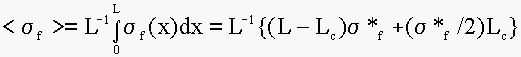 · For the linear loading model and a fiber longer than the critical transfer length loaded to just below the fiber fracture stress, the mean fiber stress is: |