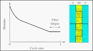 · The modulus of the laminate is a good measure of the degree of damage produced by fatigue. The diagram shows the dependence of the composite modulus on cycle ratio. |