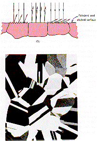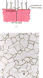 Etching involves the selective removal of material from a sample by chemical or physical means. It is a "reverse growth" process in which surfaces of lowest energy tend to be the most stable and regions of lattice distortion tend to be more susceptible to removal. The technique is used to reveal the microstructure of sample surfaces. It is also employed to prepare surfaces for other treatments. Etching techniques include: Chemical etching, electrolytic etching, thermal etching, plasma etching, and preferential oxidation. The diagrams illustrate the effect of surface etching on surface texture and reflectivity, and show optical photomicrographs of the samples. The left diagram illustrates the effect of crystallite orientation on etched roughness and reflectivity. The right diagram illustrates preferential attack at grain boundaries and the local change in surface slope that this produces.