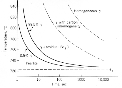 The diagram shows the T-T-T diagram for the formation of austenite. If 800 C is used as the austenizing temperature, the material should be held at this temperature for about 10,000 sec (3 hours) to reach a homogeneous state. |